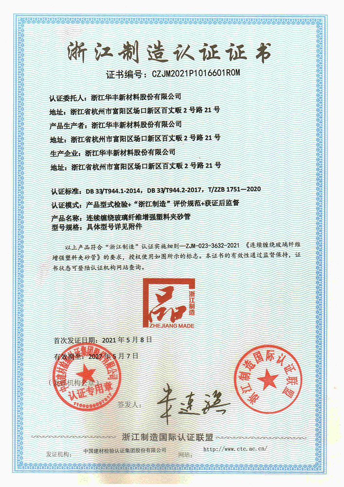 浙江制造證書-連續(xù)纏繞玻璃鋼